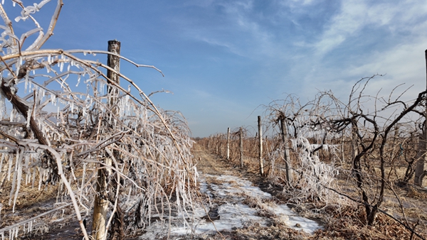 宁夏新闻网讯(记者 王莹 文/图)1月18日,宁夏迎来寒潮天气,绝大多数葡萄园已覆土静待春天,而位于贺兰山东麓最北端的玖禧酩庄,却呈现出一幅迥然不同的画面:近500亩葡萄园中,藤蔓直立于寒风,枝干裹满晶莹冰霜,在冬日阳光下闪烁如银。庄主谭志勇在近零下20摄氏度的严寒中,穿梭其间,手持设备进行直播,带领屏幕另一端的观众实时走进这片“不眠的葡萄园”,直观感受中国葡萄酒产业在风土与科技融合中的坚韧探索。