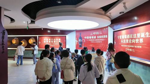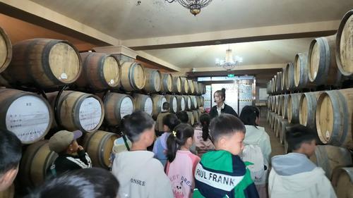 “大家看到是宁夏第一棵酿酒葡萄树,现在已有47年历史。”10月6日上午,20多名学生走进宁夏农垦中殊玉泉国际酒庄,开展了一次自然风光与文化底蕴巧妙融合的深度葡萄酒探秘体验。在讲解员的带领下,学生们参观了密闭的发酵罐、精致的橡木桶,了解到葡萄酒是如何从一颗颗饱满的葡萄到一瓶瓶醇香美酒的神奇转变。“今天中秋节,来到酒庄我收获非常多的小惊喜,在地下酒窖我看到一个个圆木桶,上面的小纸条就像它的身份证,记录着它什么时候放进去,未来变成什么味道。今天中秋节,希望大家的生活像葡萄酒一样甜蜜。”8岁的朱泽恩看着木桶惊喜地说。“今天我跟随研学队伍走进酒庄,好像踏入一个戈壁变宝地的神奇世界,原以为贫瘠的沙漠,竟能种出好喝的葡萄酒。”12岁的张容畅兴奋地说。