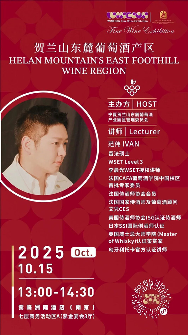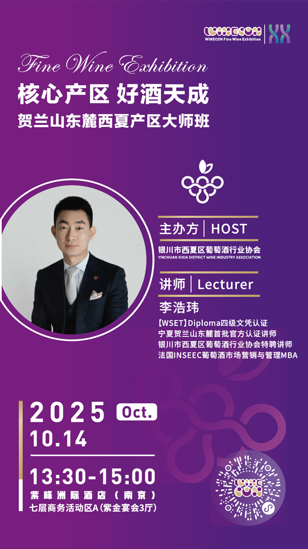 明起,WineCon聚恒·2025秋季精品酒展将于南京紫峰洲际酒店率先拉开帷幕,汇集法国、西班牙、新西兰、中国等全球20多个国家的经典与新兴产区。宁夏贺兰山东麓产区展位号为NX01-NX15,并将举办由留法硕士、WSET3级认证、法国侍酒师协会会员、ISG认证侍酒师范伟主讲的产区大师班;西夏产区则位于W072-W087展位,推出“核心产区·好酒天成”主题大师班,向全球客商与消费者展现中国葡萄酒的卓越品质。